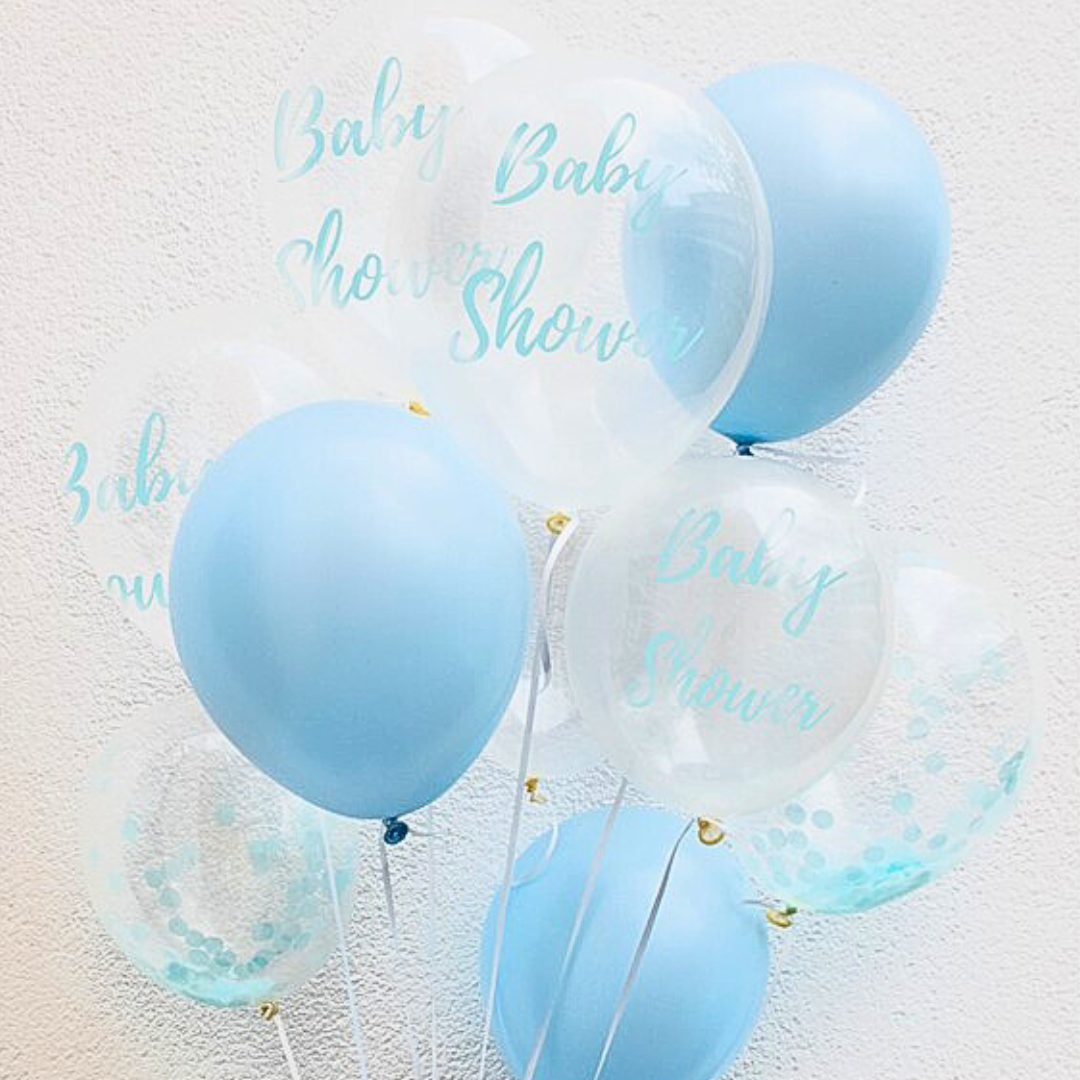 Das sind die perfekten Ballons für eine Baby Shower! Das Set besteht aus 10 Latexballons in drei unterschiedlichen Designs: einem Ballon mit babyblauem Konfetti, einem Ballon in Hellblau Pastell und einem transparenten Ballon mit der Aufschrift "Baby Shower".
